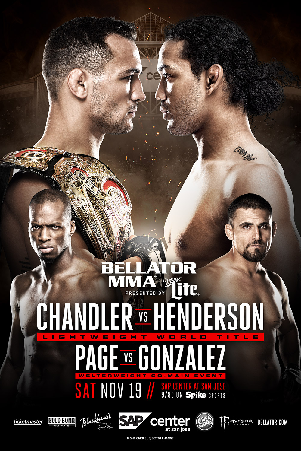 Fresh off his victory during the main event of “Bellator 160: Henderson vs. Pitbull,” Henderson has earned a title shot in the ultra-competitive lightweight division against its current titleholder in Chandler. With 10 of his 24 career wins coming by way of submission, the 32-year-old Glendale, AZ native will try to do what no other opponent has ever done and finish Chandler via submission. Nicknamed “Smooth” for his silky style and demeanor, Henderson took care of business in his most recent bout, utilizing impeccable technique to defeat Bellator MMA veteran Patricio “Pitbull” Freire after a broken fibula forced the Brazilian star to forfeit in the second round. Henderson hopes to avenge his first title shot with the promotion and trot off with Bellator MMA gold on Nov. 19.