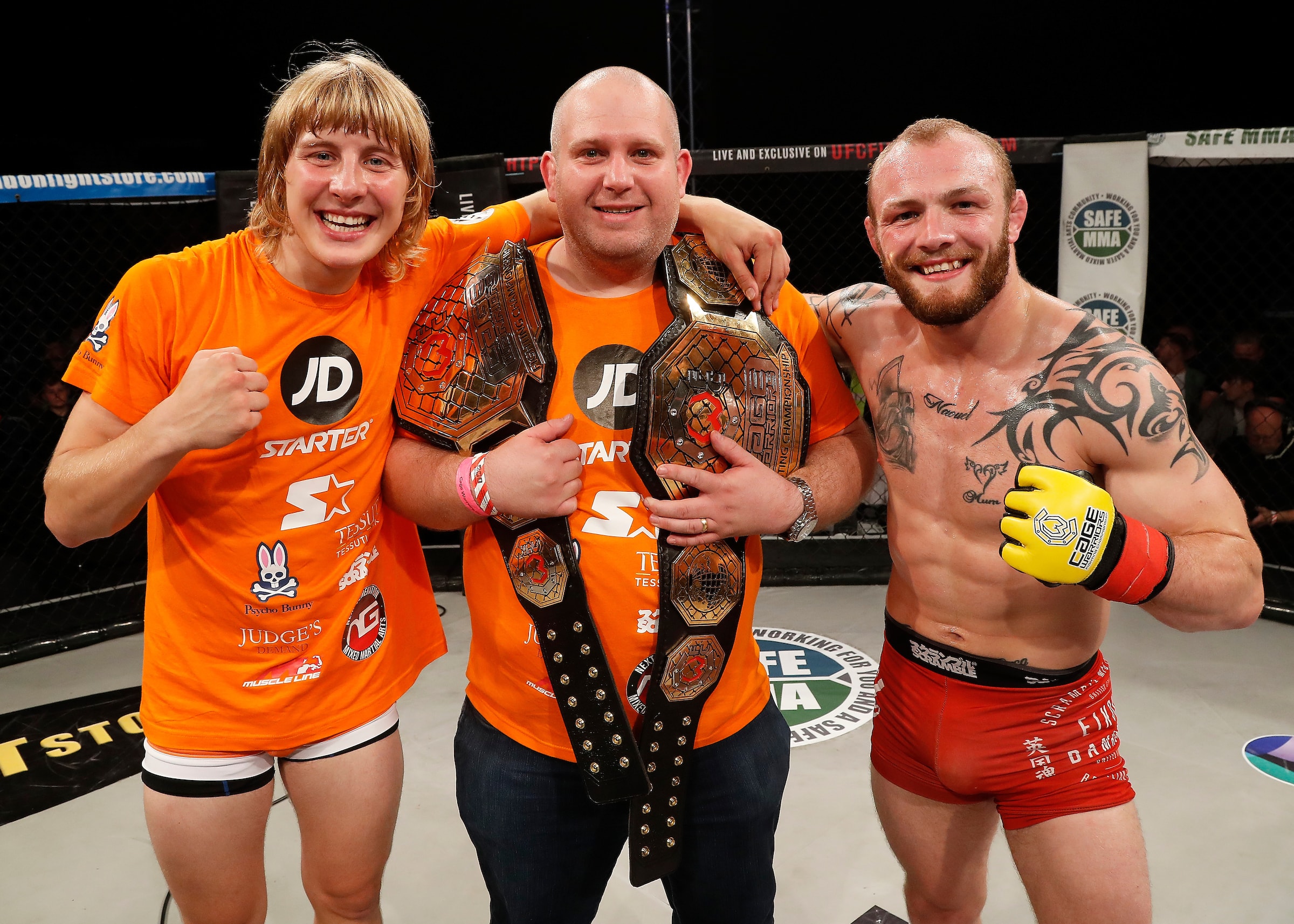 Paul Rimmer (centre) with Pimblett and Fishgold. Credit: Cage Warriors/Dolly Clew